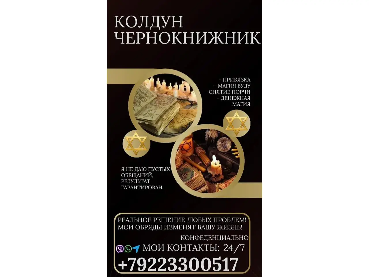 Колдун Чернокнижник Роберт Вячеславович: 18 лет практики обрядовой магии для решения ваших проблем. Ищете мощную и эффективную магическую помощь? Колдун Чернокнижник Роберт Вячеславович – потомственный маг с 18-летним опытом, предлагает широкий спектр обрядовых услуг для решения самых сложных жизненных ситуаций. Мои услуги: Любовная магия: Привороты, отвороты, гармонизация отношений, во...