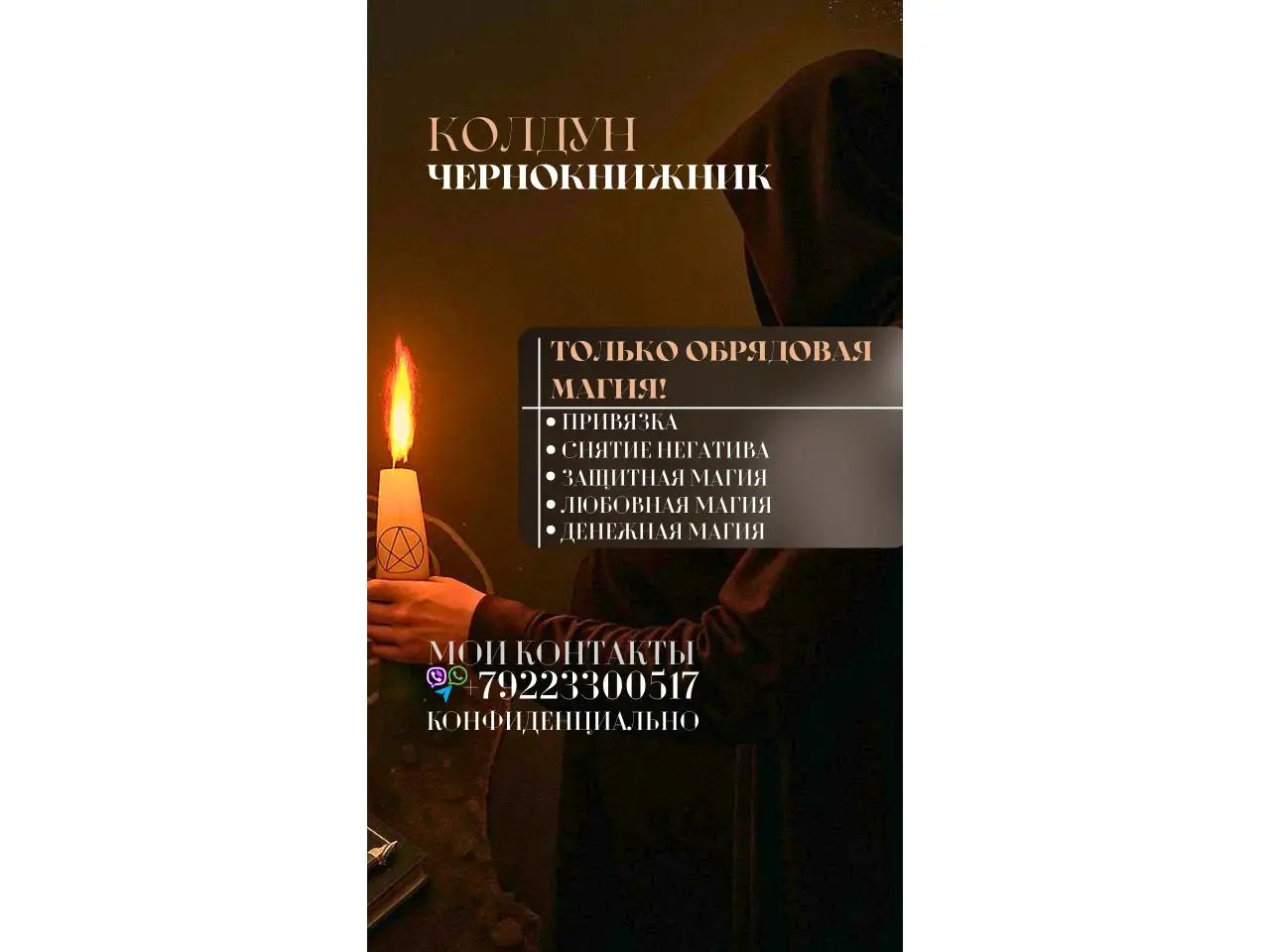 Приветствую! Устали от пустых обещаний гадалок? Я, Роберт Вячеславович, потомственный колдун и чернокнижник с 18-летним опытом, предлагаю реальную помощь в решении самых сложных жизненных ситуаций с помощью обрядовой магии.